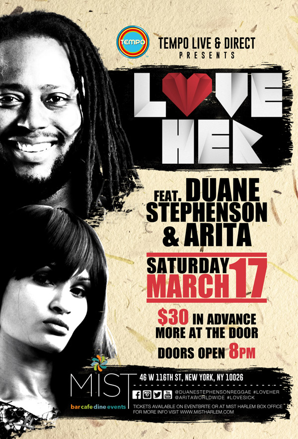 New York City, Get Ready for a NIGHT OF LOVE when TEMPO Networks presents "LOVE HER" featuring Duane Stephenson Live. Join Duane for his brand new single release "LOVE HER" Yes, the maestro from Jamaica, Saturday March 17th at MIST HARLEM -- WHAT A NIGHT!! -- with Duane Stephenson Live along with her majesty, the beautiful and soulful TEMPO ARTIST ARITA with her Brand New Single "LOVE SICK". Broadcast on TEMPO Television OPTIMUM 1105, it's another NIGHT TO REMEMBER Saturday March 17th at MIST HARLEM with Duane Stephenson LIVE performing his hot new single LOVE HER along with TEMPO Recording Artist ARITA and other special guest ARTIST & DJ's