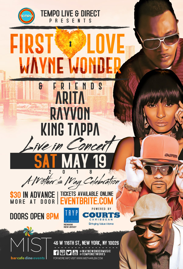 New York City, Get Ready for a NIGHT OF LOVE when TEMPO Networks presents "FIRST LOVE" featuring Wayne Wonder & friends, ARITA, Rayvon and King Tappa Live in Concert. Join us Saturday May 19th at MIST HARLEM -- WHAT A NIGHT!! -- with Wayne Wonder along with her majesty, the beautiful and soulful TEMPO ARTIST ARITA with her Brand New Single "LOVESICK". Broadcasted on TEMPO Television OPTIMUM 1105, it's another NIGHT TO REMEMBER Saturday MaY 19th at MIST HARLEM with Wayne Wonder & Friends Live in Concert. Powered by Courts and Tryp Newark.